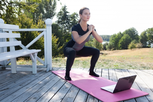息を吐きながらスクワットで下半身の筋肉をストレッチ。