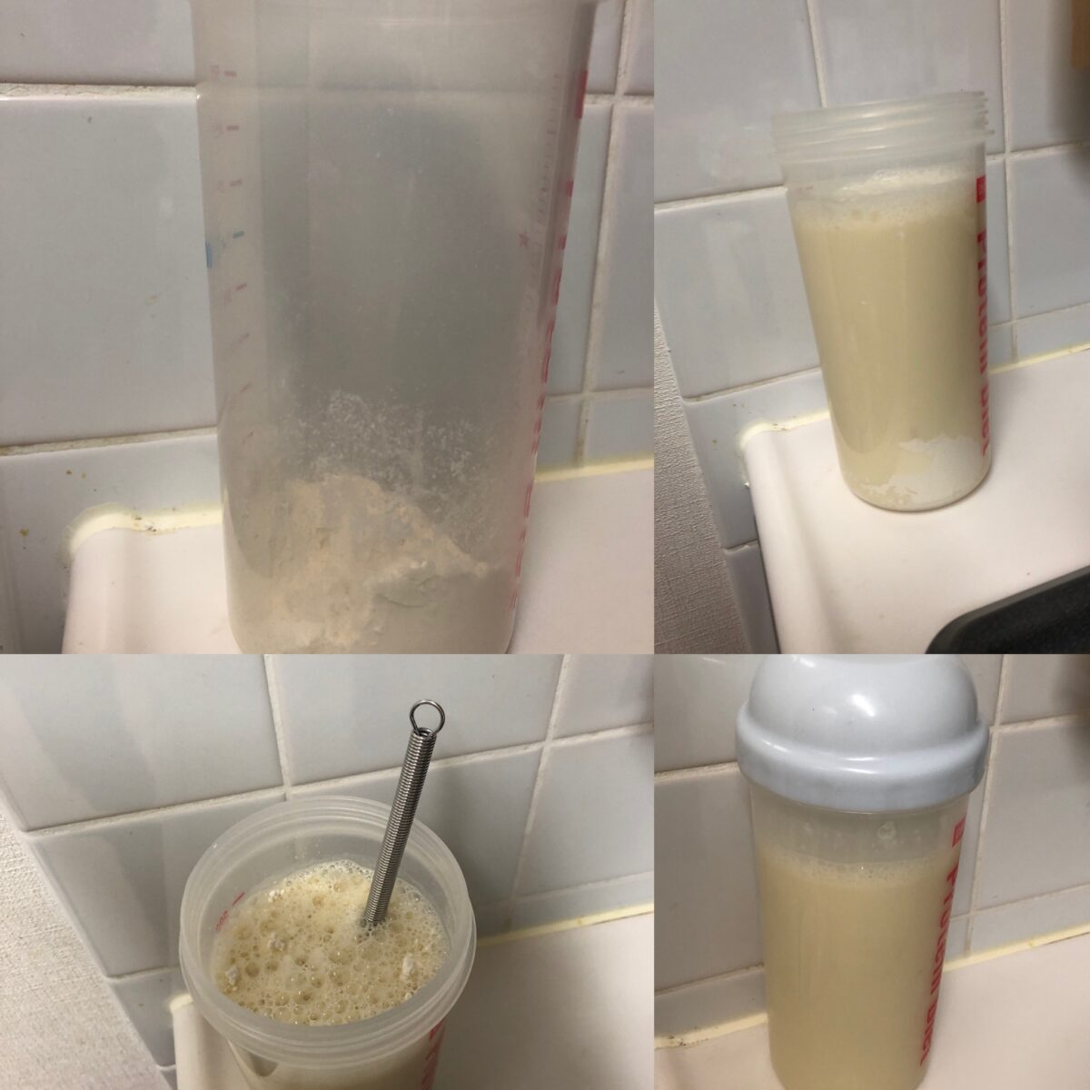 ①シェイカーに小麦粉と豆乳500㎖を入れて、箸などを使って、だまにならないように混ぜます。